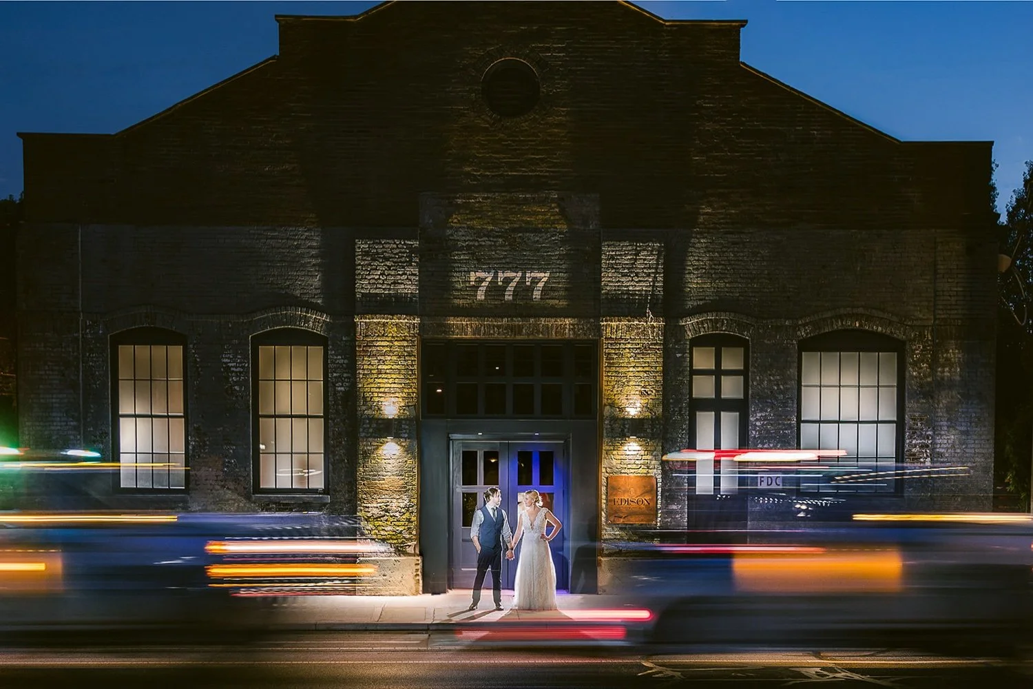 Long exposure of the Ellis wedding venue at night with a bride and groom.