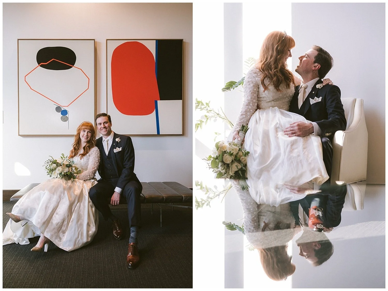 Robby and Brittany’s wedding ceremony took place in a room with huge pipe organs, giving a grand setting to capture all their special moments. After the ceremony, I whisked away the newlyweds for some couples portraits. Brittany and Robby were complete troopers, walking hand-in-hand from one end of the venue to the other, posing in front of different backdrops. One of my absolute favorite pictures of them is the one in front of a beautifully decorated Christmas tree - signifying the season of love and togetherness. We also headed outdoors, where the newlyweds hopped on a red trolly, showcasing their fun, adventurous personalities!
